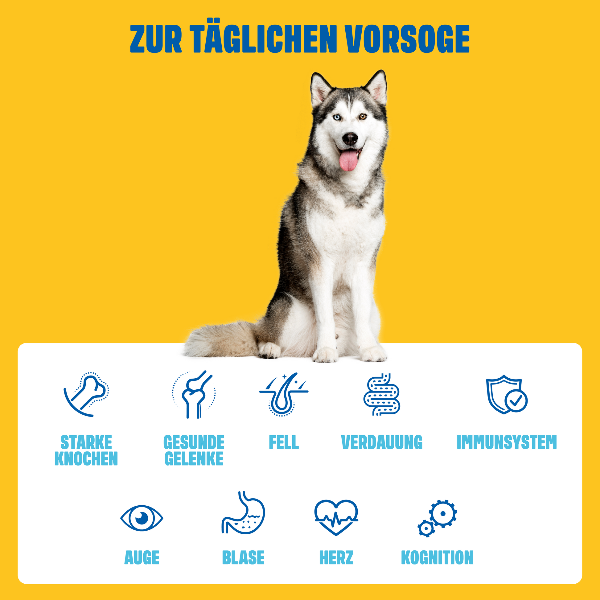 Wir empfehlen außerdem, die ersten paar Tage mit der Hälfte der empfohlenen Dosis zu beginnen, damit sich dein Hund an die Ergänzungsfuttermittel gewöhnt.