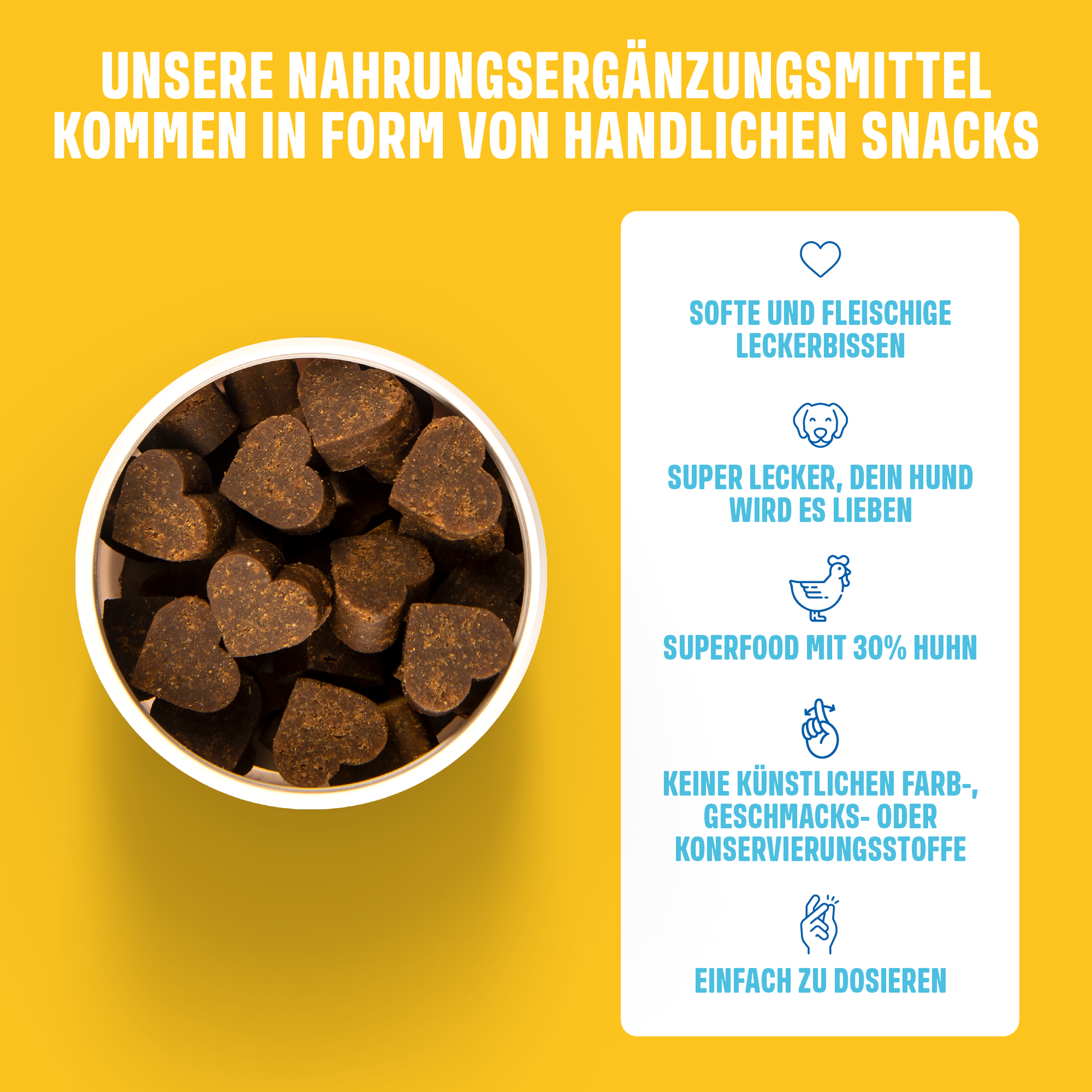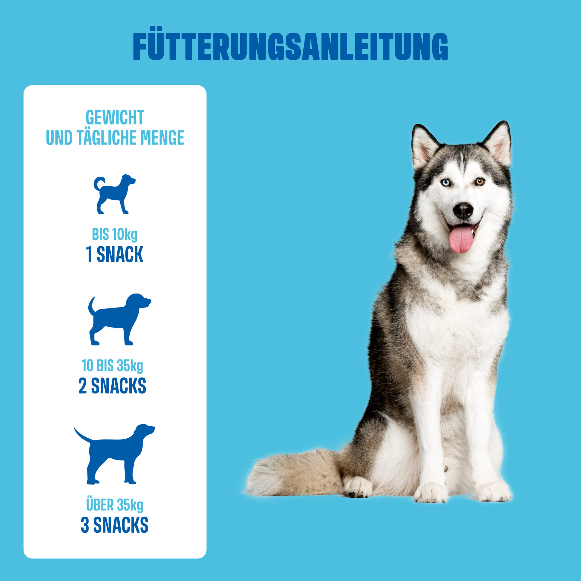 Gelenkbeschwerden. Sie enthalten Inhaltsstoffe wie Glucosamin und Chondroitin, die die Gesundheit der Gelenke und Knochen erhalten können. - Glänzendes Fell und gesunde Haut mit SKIN AND COAT: Diese Snacks sind ideal, um das Fell deines Hundes gesund und glänzend zu halten. Sie enthalten wichtige Nährstoffe, wie Omega-3-Fettsäuren.