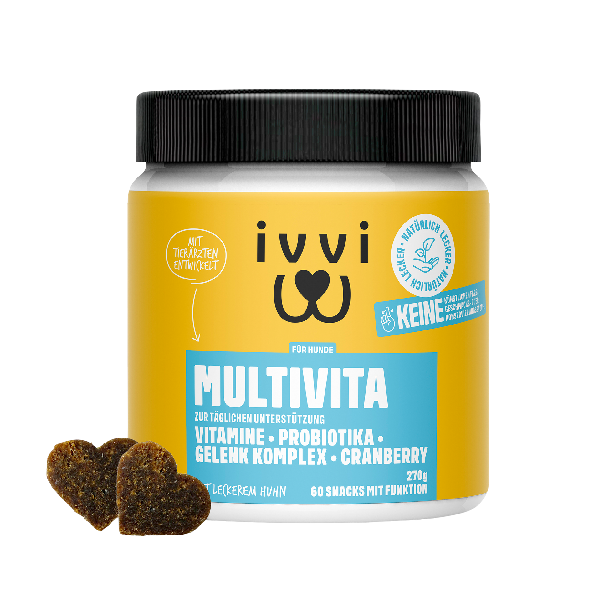 Oft enthalten Alleinfutter nicht alle Vitamine, die Hunde brauchen. Zudem fressen einige Leckermäuler nicht ausreichend Hundefutter, um die richtige Versorgung zu erreichen, weil sie stattdessen mit ungesunden Leckerlis verwöhnt werden. ivvi MULTIVITA ist eine gesunde Alternative, die den Genuss von Snacks mit der richtigen Vitaminzufuhr verbindet.